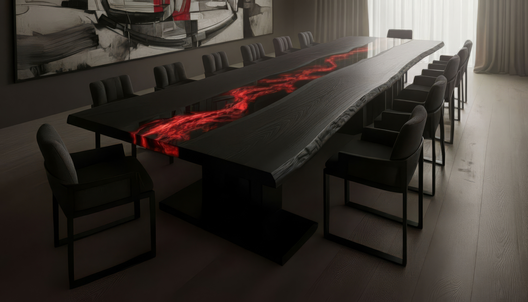 Każdy stół powstaje z ręcznie wyselekcjonowanego czarnego dębu i żywicy epoksydowej, podkreślając naturalne piękno drewna. Łączymy tradycyjne rzemiosło z precyzją nowoczesnej technologii, dopracowując każdy detal. Efekt to unikatowy, luksusowy stół, który przetrwa pokolenia.